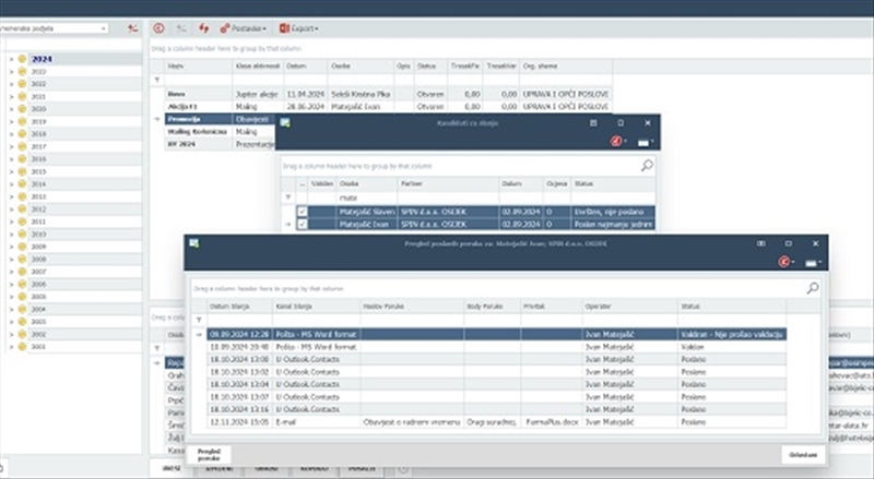 Standarno podržani kanali slanja poruka su e-mail, priprema za mailing via Word & Corel, export prema Outlook Contacts mapi.